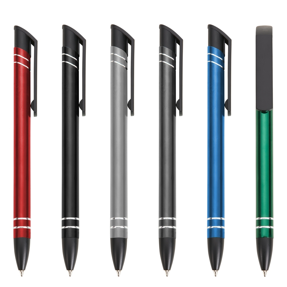 Caneta plástica inteira prata com detalhes inferiores coloridos. Possui clip de metal com 3 cortes superiores, vinte e oito pedras strass com anel em relevo no centro. Aciona por clique.