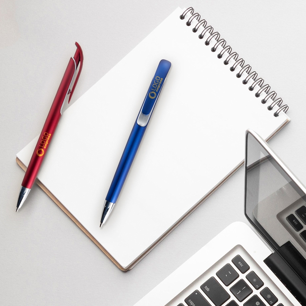 Descrição: Caneta plástica na cor colorida fosca com detalhe prata ao redor do clip e na ponteira. Aciona por clique.